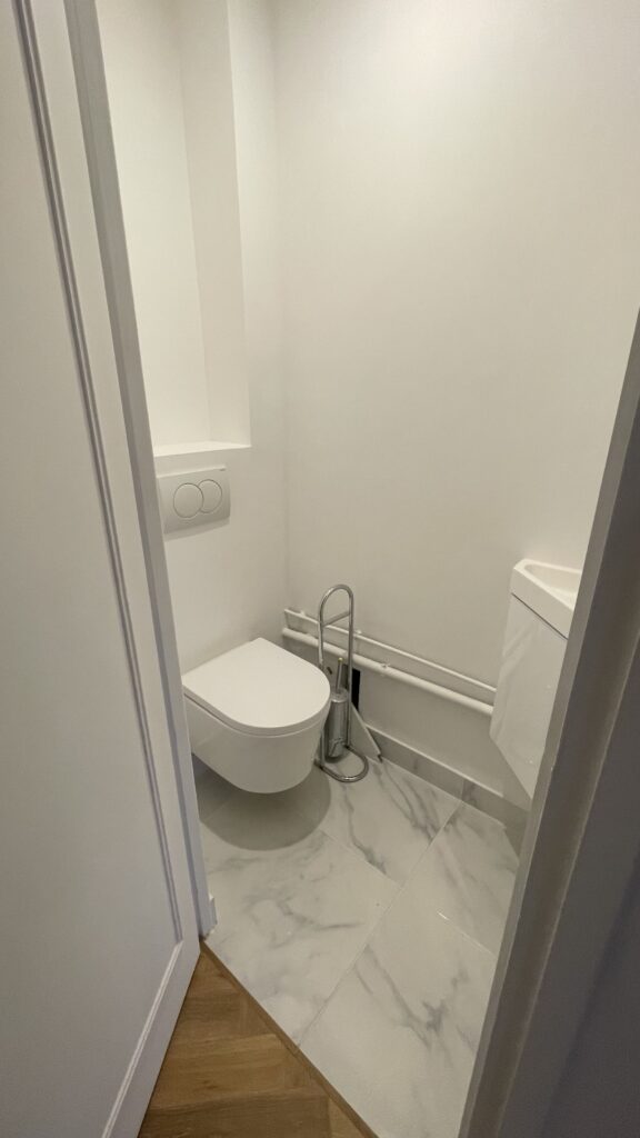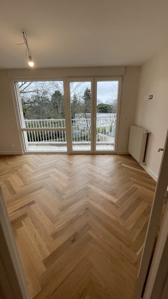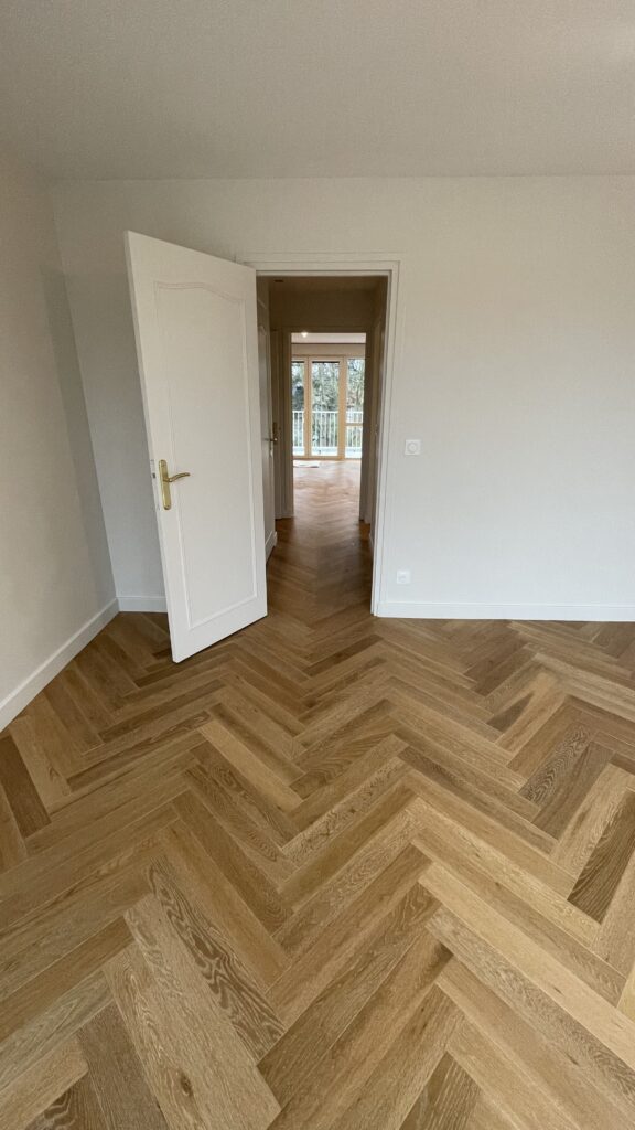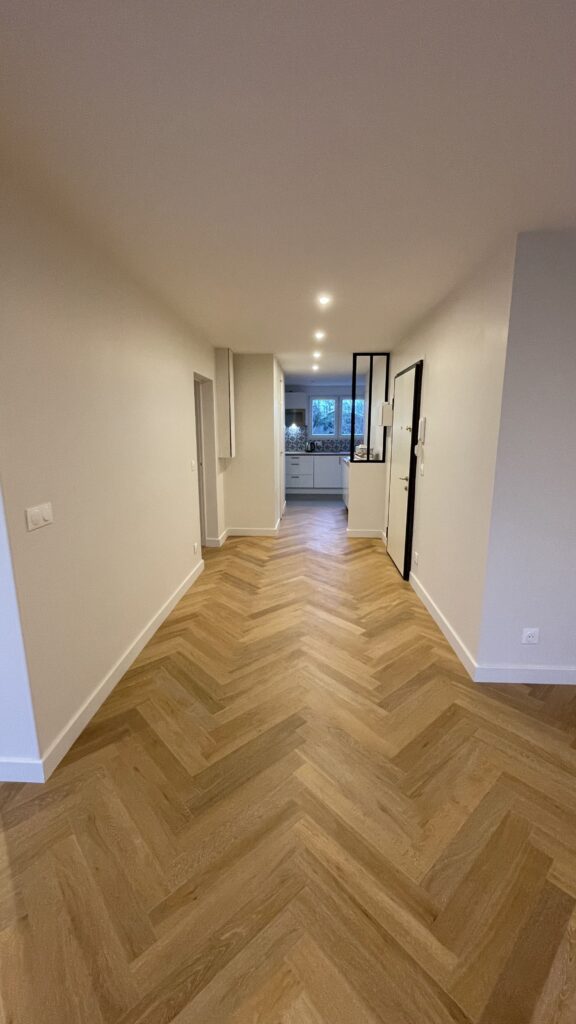 - Pose d’un parquet en chevron sur tout l’appartement, donnant charme et cohérence à l’ensemble.