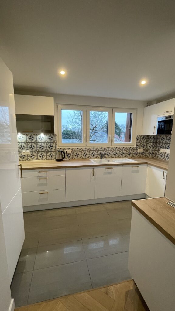 - Installation d’une cuisine neuve, spacieuse et entièrement équipée, avec plan de travail bois et crédence décorative.