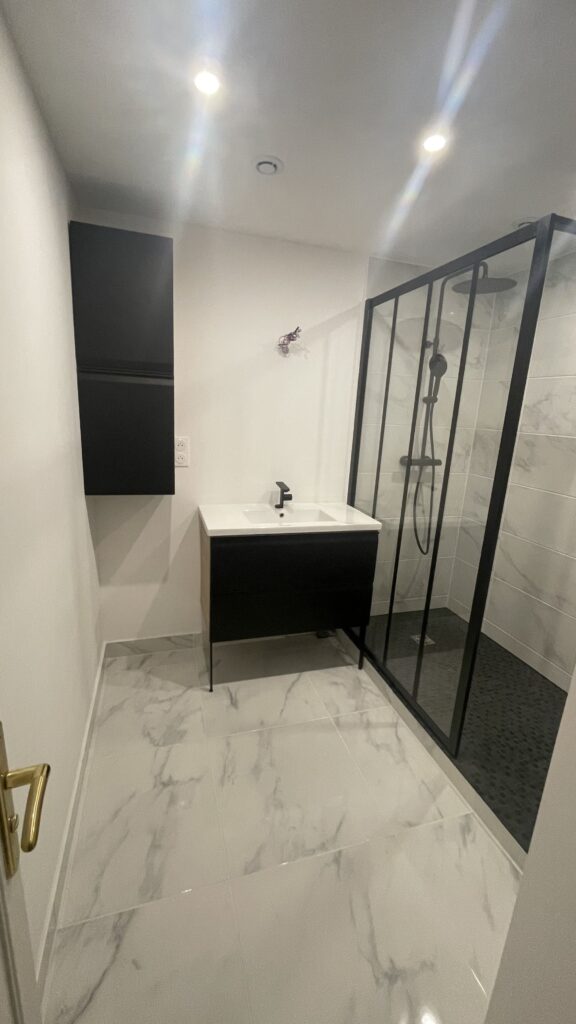 - Reconstruction d’une salle de bain moderne : grande douche, meuble vasque, carrelage effet marbre, robinetterie noire et éclairage intégré.