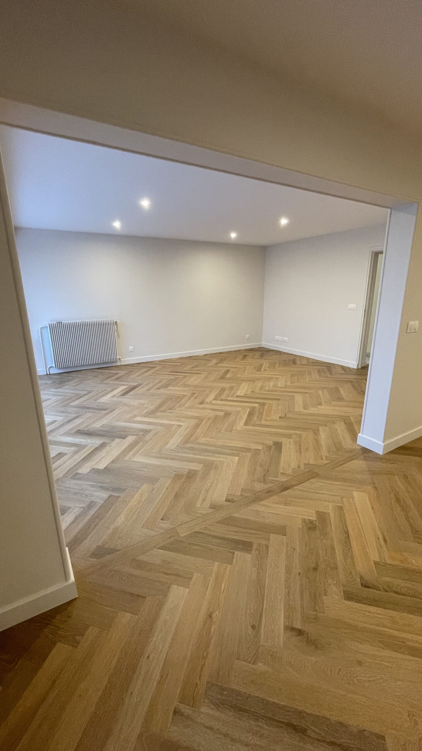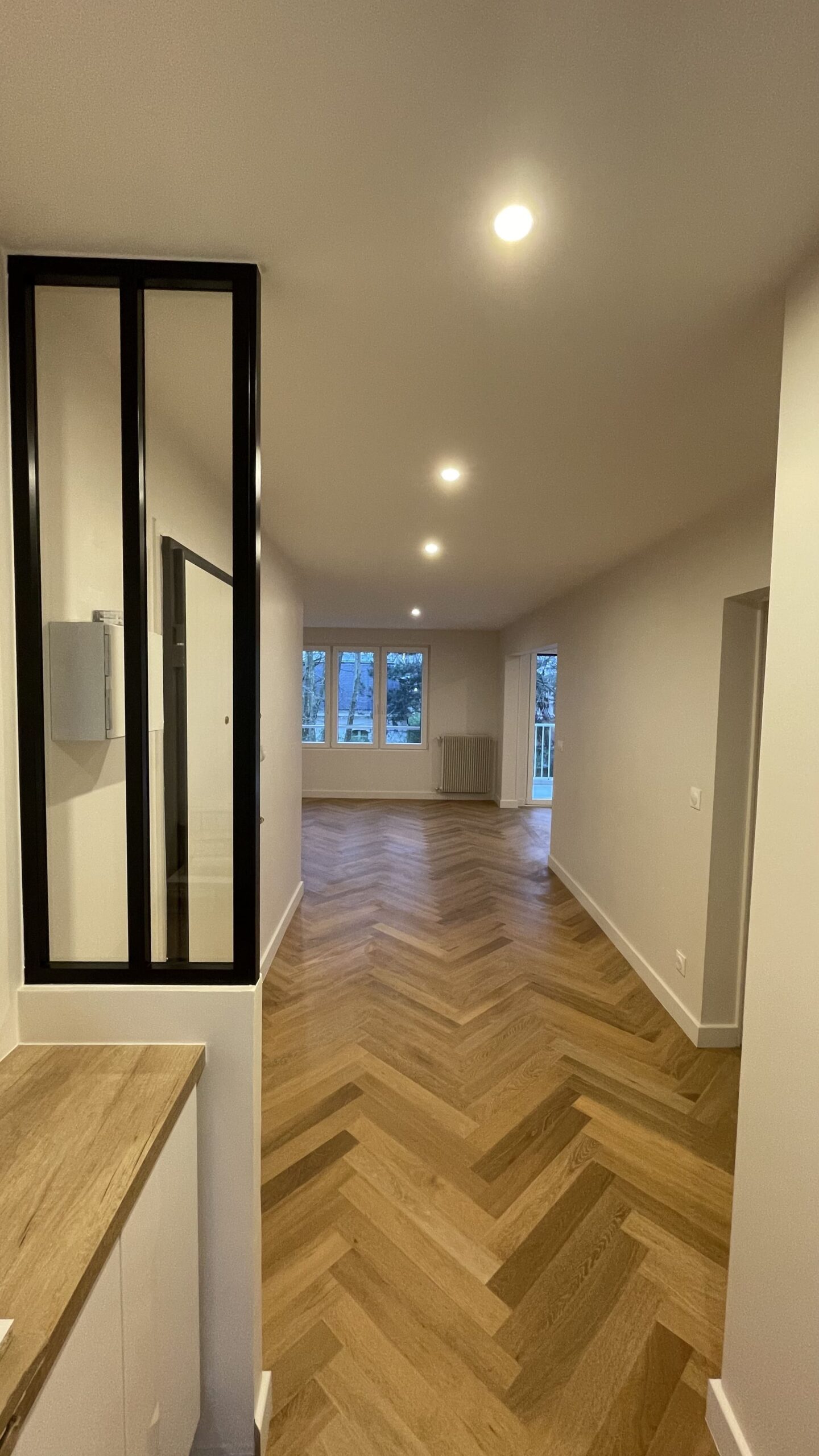 - Pose d’un parquet en chevron sur tout l’appartement, donnant charme et cohérence à l’ensemble.