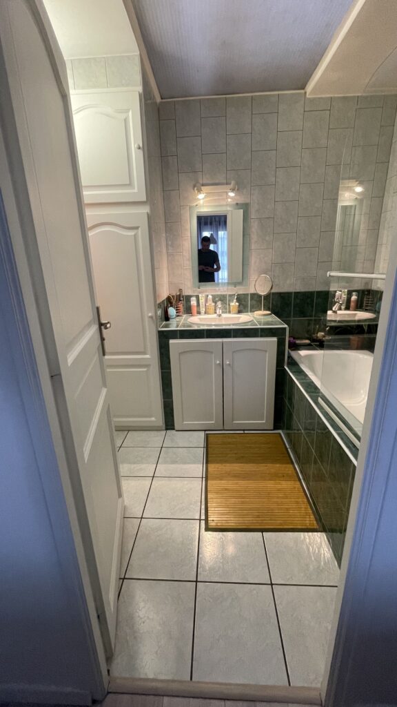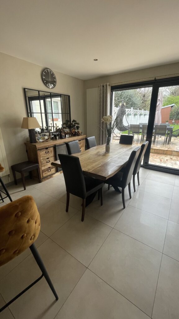 - Installation d’un sol en carrelage grand format dans toutes les pièces de vie pour une cohérence visuelle et un entretien optimal.