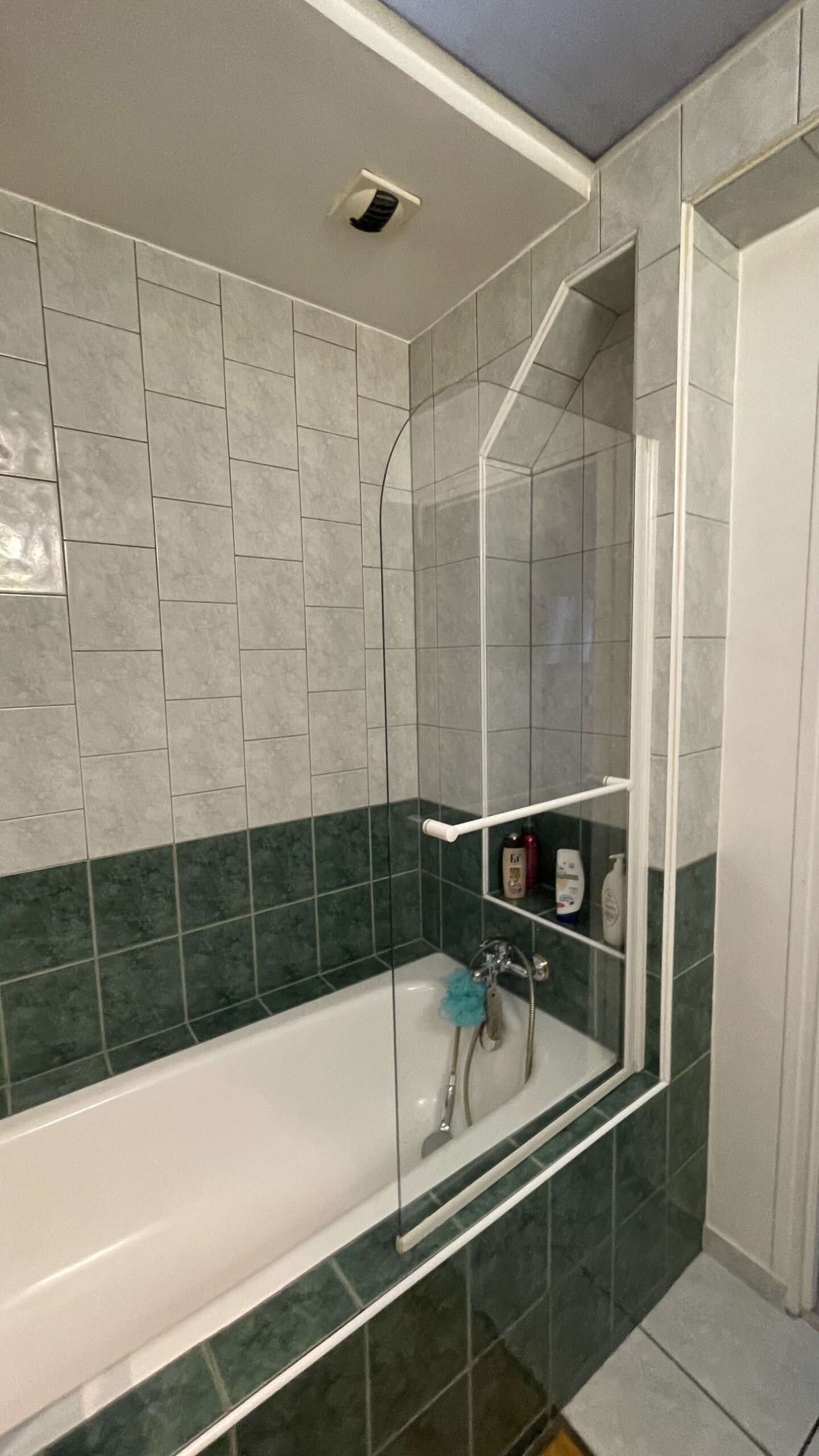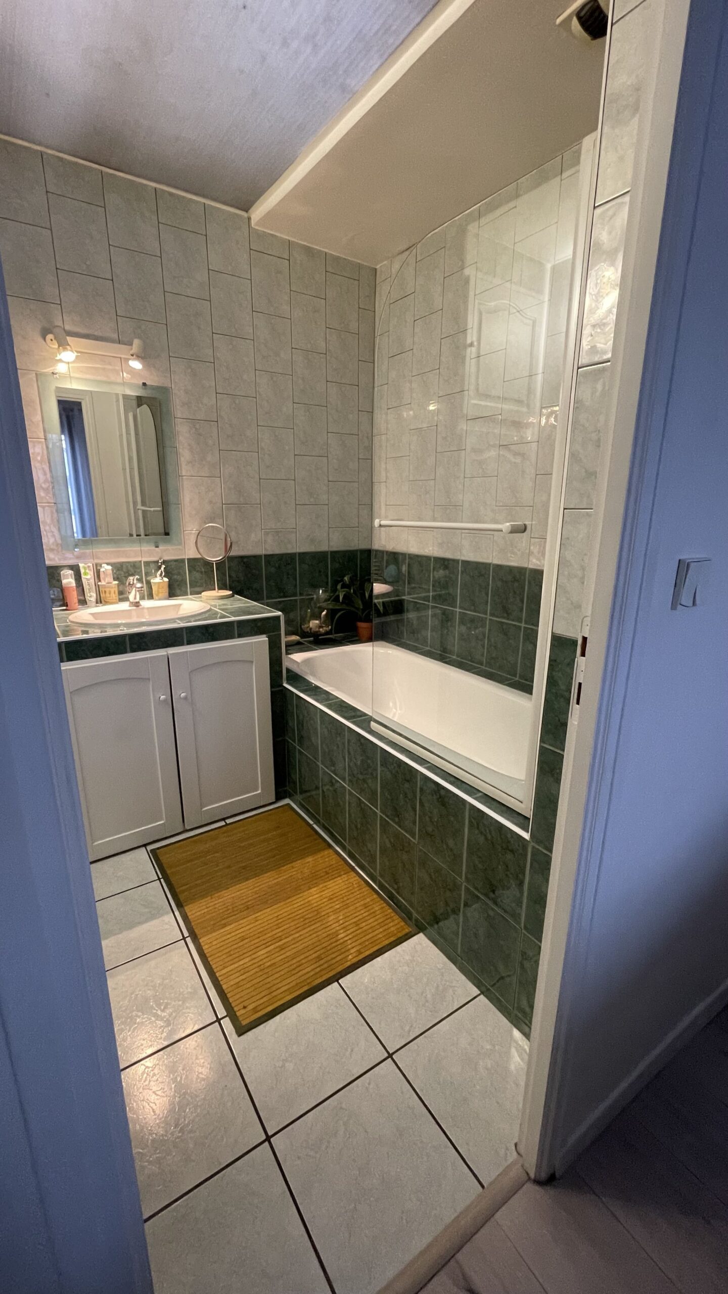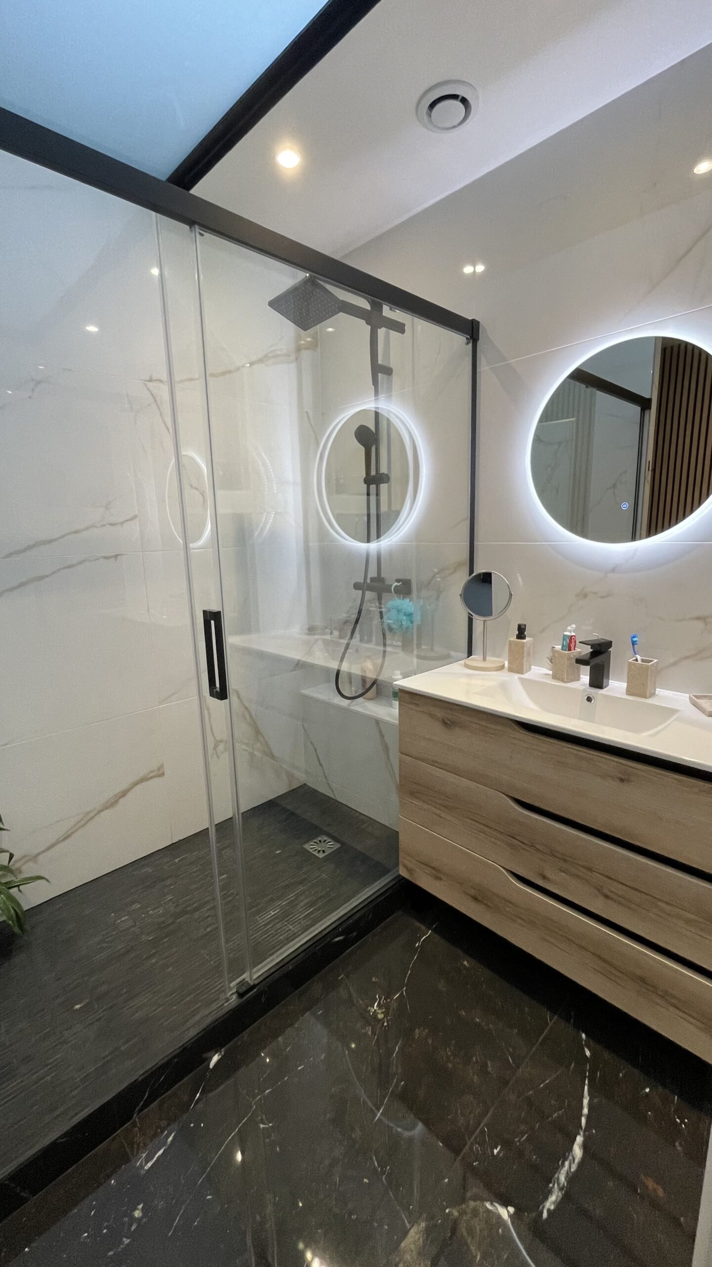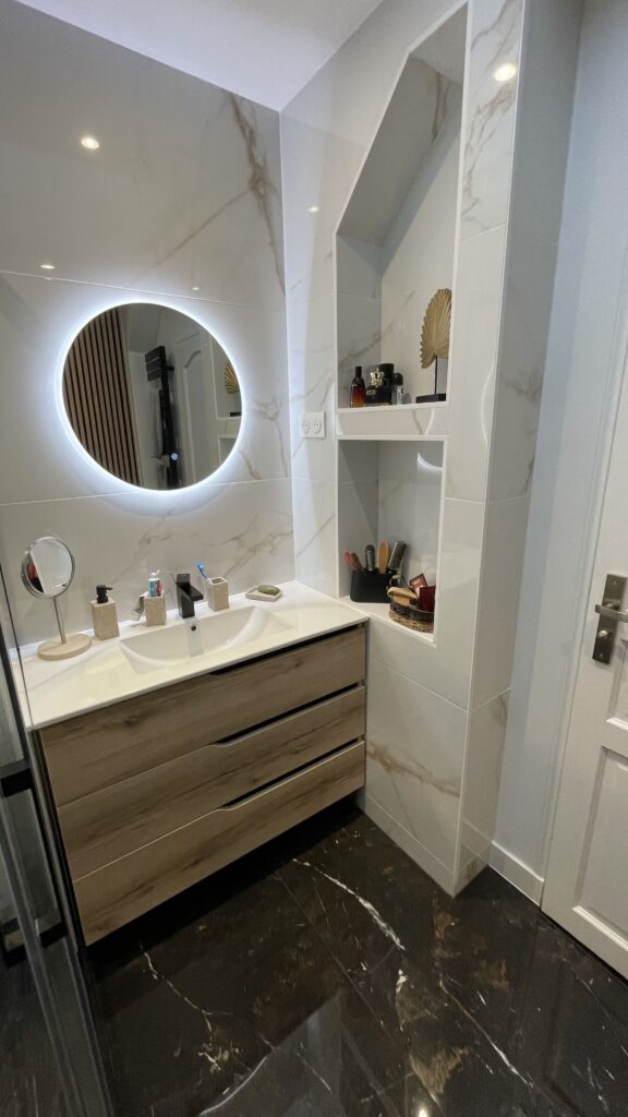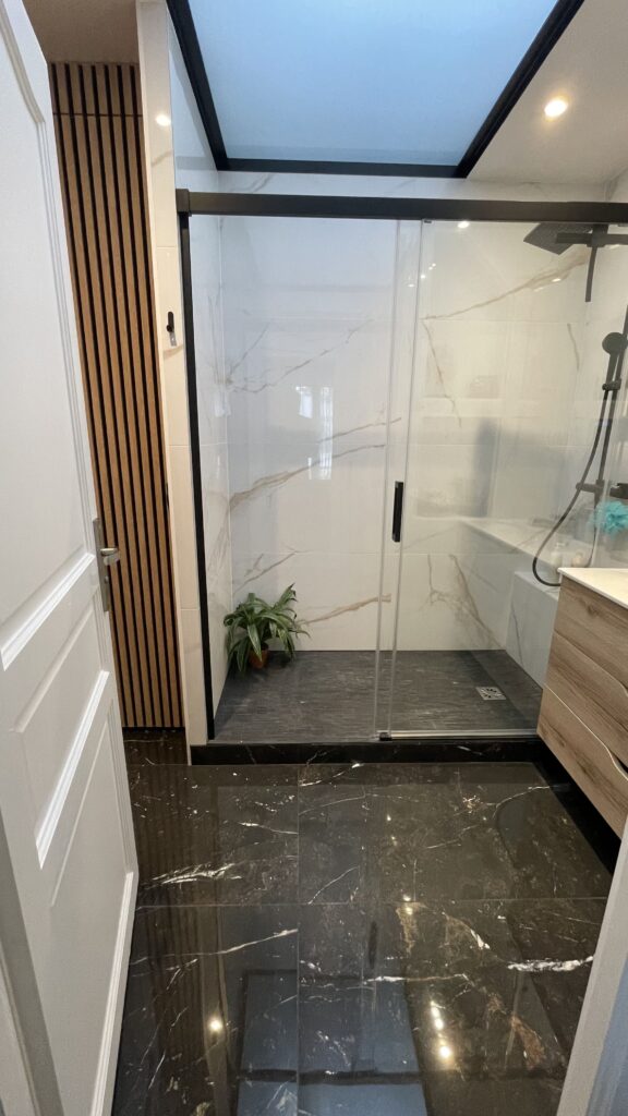 - Refonte complète de la salle de bain : douche XXL avec parois vitrées, carrelage grand format effet marbre, miroir rétro-éclairé, meuble vasque en bois et détails noirs mats pour un style haut de gamme.