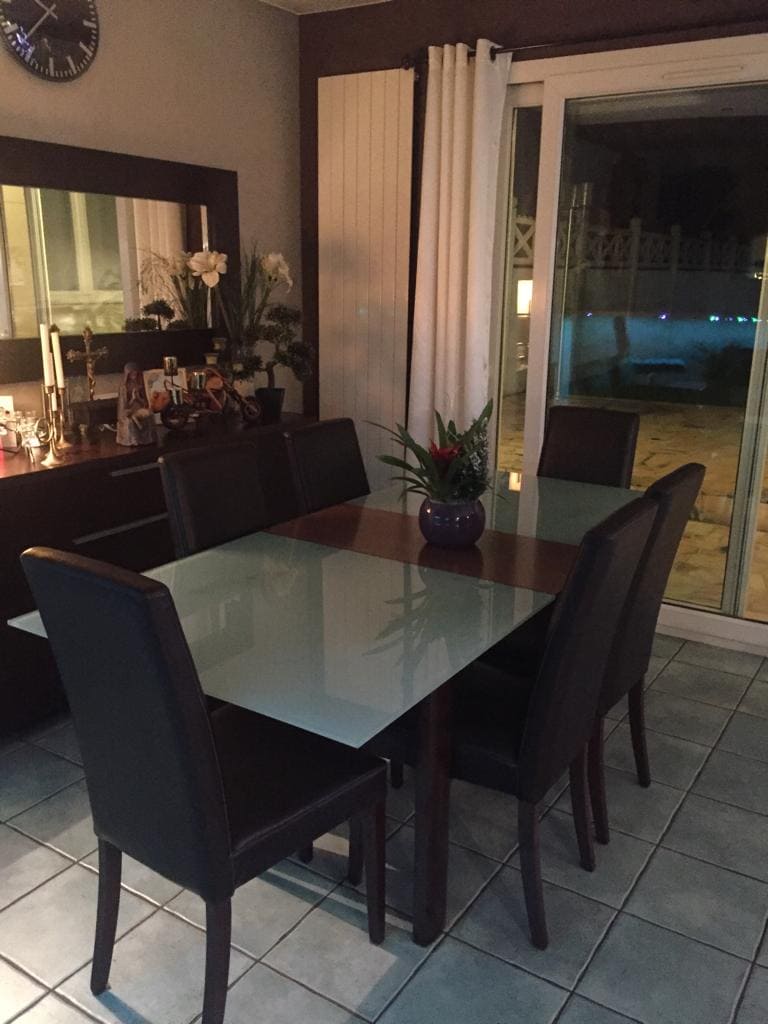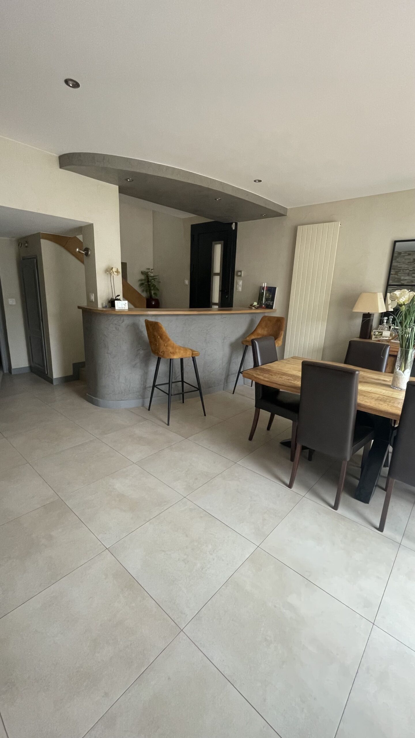 - Transformation esthétique : mise en enduit décoratif intégrale de la maison, suppression des textures datées, installation de grandes dalles contemporaines et harmonisation de la décoration. Avec un bar repensé, matériaux modernes, éclairages intégrés et optimisation de l’agencement.