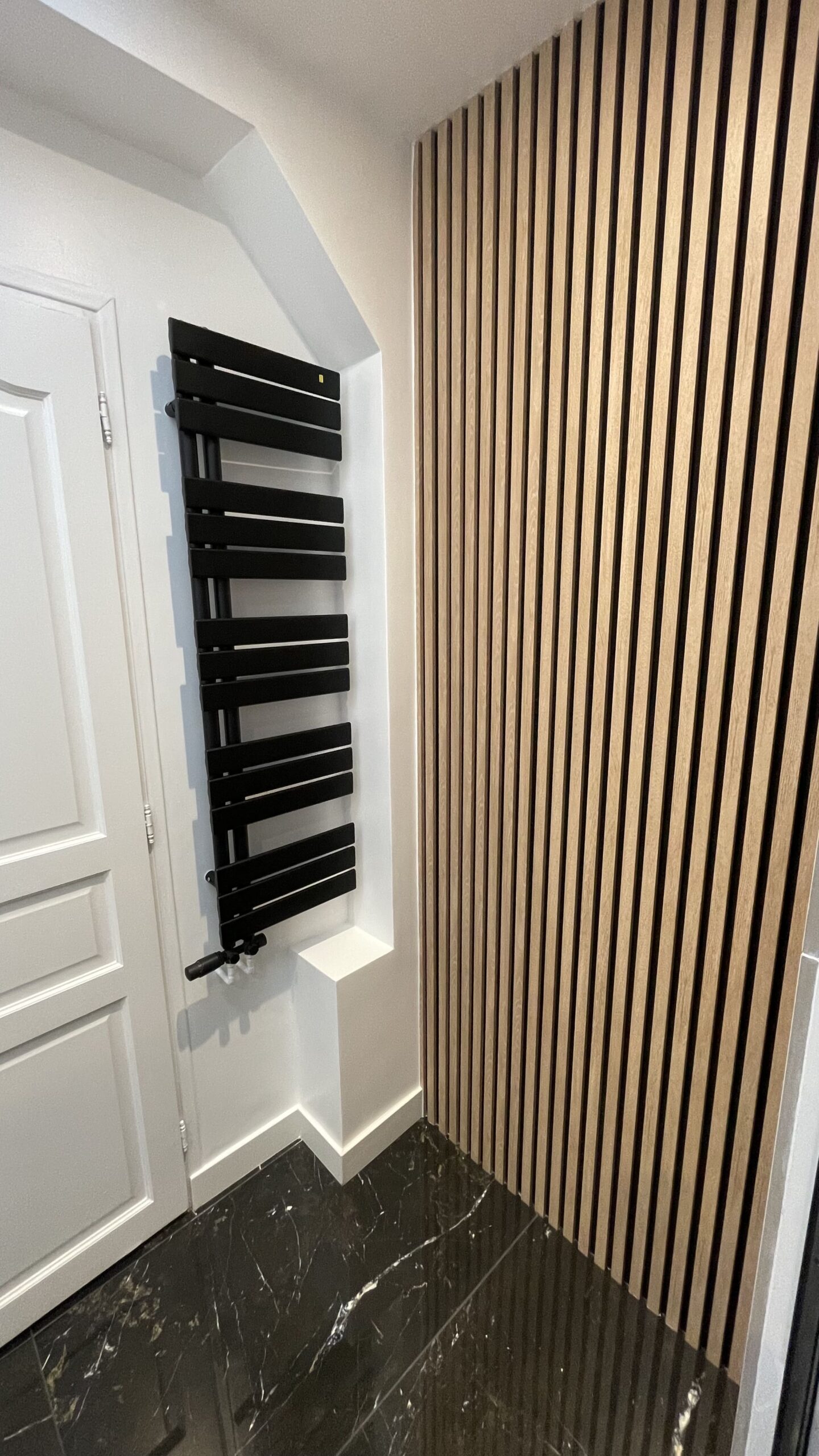 - Ajout d’un mur décoratif moderne avec lames bois et radiateur design pour une touche architecturale chaleureuse.